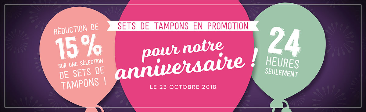 Stampin’ Up! va bientôt souffler sa 30e bougie, et le 23 octobre, nous célébrons avec notre grande promotion anniversaire sur des sets de tampons. Pendant 24 HEURES SEULEMENT, vous et vos clientes pouvez économiser 15 % sur une sélection de sets de tampons. Consultez notre page Sets de tampons en promotion pour notre anniversaire